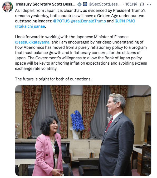 贝森特的言论被视为对日本新政府货币政策倾向的直接回应。日本新任首相高市早苗是“安倍经济学”的倡导者,她曾敦促日本央行与政府合作以提振需求,这被分析人士视为对央行加息计划的抵制。