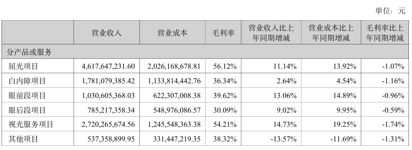 虽然三季报没有披露各类业务盈利情况,但从先前披露的半年报来看,公司核心业务盈利能力全面承压,毛利率水平全线下滑。其中,营收占比最大的屈光项目毛利率降至56.12%,同比减少1.07个百分点;视光服务毛利率同比减少1.74个百分点至54.21%;手术价格持续下行,部分地区屈光手术价格已从2万元降至1.1万元左右。