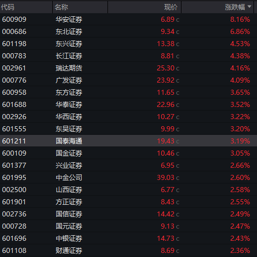 临近午盘,券商股集体拉升,华安证券一度强势涨停,截至收盘,华安证券涨超8%,东北证券涨超6%,东兴证券、长江证券、瑞达期货、广发证券等涨超4%。东方证券、华泰证券、华西证券等纷纷走高。