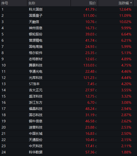 量子科技概念股中,科大国创涨超12%,国盾量子涨超11%,天融信、神州信息等封板。
