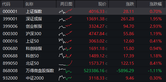 10月29日,A股午后全线拉升,沪指站稳4000点,再创反弹以来新高。创业板涨近3%,北证50大涨逾8%,创9个月最大单日涨幅。新能源概念股爆发,光伏产业链、储能方向涨停潮;算力硬件股、有色金属、券商等涨幅居前。