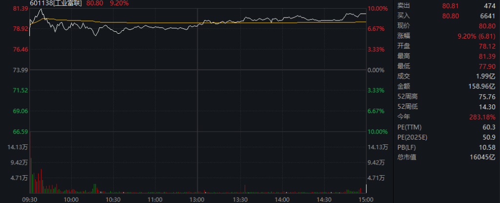 同时,液冷服务器、量子科技等盘中拉升。早盘液冷服务器概念股表现活跃,工业富联一度触及涨停,续创历史新高,收盘涨9.2%。
