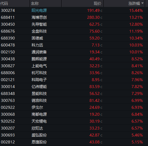 储能方向今天高开高走,阳光电源涨超15%,海博思创、先导智能、金盘科技等涨幅居前。