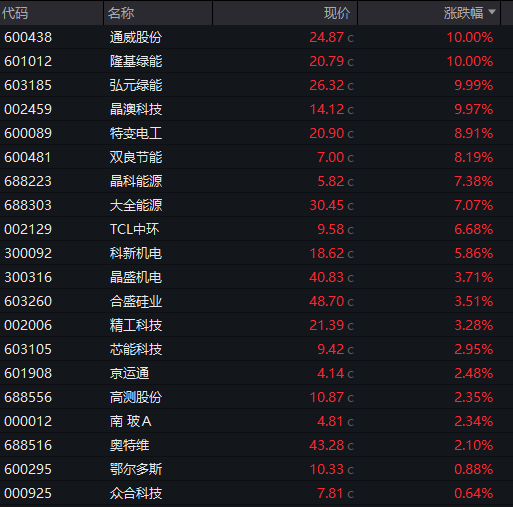 硅能源概念股午后爆发,通威股份、隆基绿能纷纷涨停,晶澳科技、特变电工、双良节能等纷纷拉升。