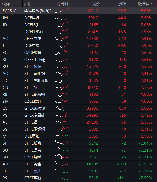 商品:国内商品期货多数收涨,截至收盘,集运欧线涨超5%,焦煤涨超3%,鸡蛋涨超2%,焦炭、铁矿石、沪银、玻璃、橡胶、工业硅、氧化铝、沪铜涨超1%,菜籽、燃油、沪金等少数品种逆势下跌。