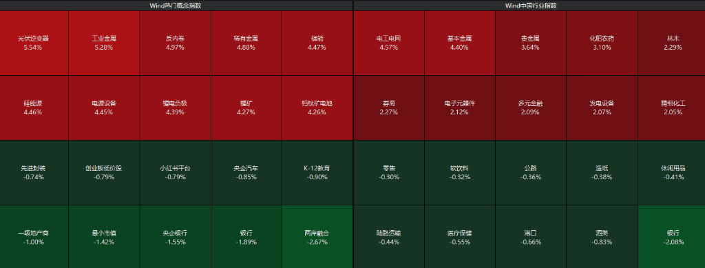 盘面上,个股上涨与下跌家数相当,全市场超2600只个股上涨。今日全市场成交约2.29万亿,沪深两市成交额2.26万亿,较上一个交易日放量近1100亿。板块方面,光伏等新能源方向集体爆发,光伏逆变器、硅能源、储能等方向掀起涨停潮,有色金属大涨,锂矿股走强,算力硬件股、券商板块活跃,下跌方面,白酒、银行股等板块下跌。