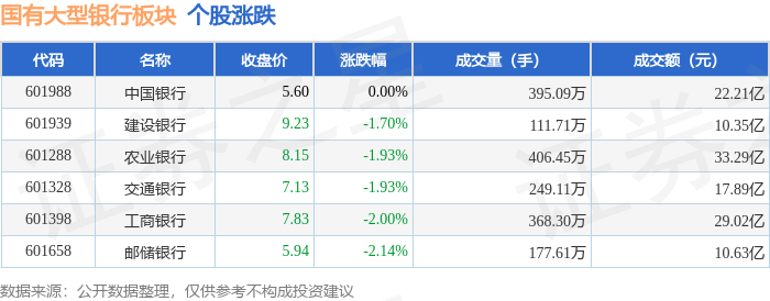 证券之星消息,10月29日国有大型银行板块较上一交易日下跌1.62%,邮储银行领跌。当日上证指数报收于4016.33,上涨0.7%。深证成指报收于13691.38,上涨1.95%。国有大型银行板块个股涨跌见下表: