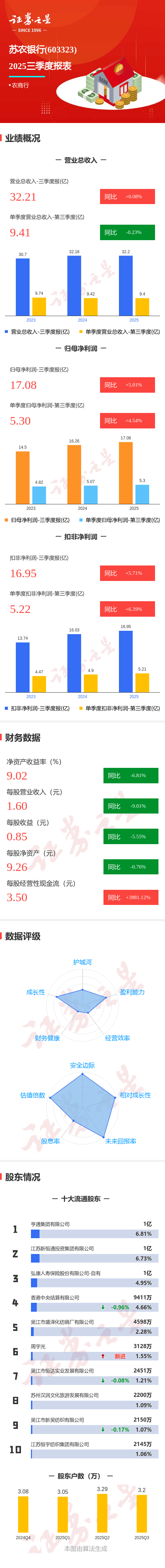 证券之星消息,苏农银行2025年三季报显示,前三季度公司主营收入32.21亿元,同比上升0.08%;归母净利润17.08亿元,同比上升5.01%;扣非净利润16.95亿元,同比上升5.72%;其中2025年第三季度,公司单季度主营收入9.41亿元,同比下降0.23%;单季度归母净利润5.3亿元,同比上升4.54%;单季度扣非净利润5.22亿元,同比上升6.4%;负债率91.75%,投资收益11.16亿元。