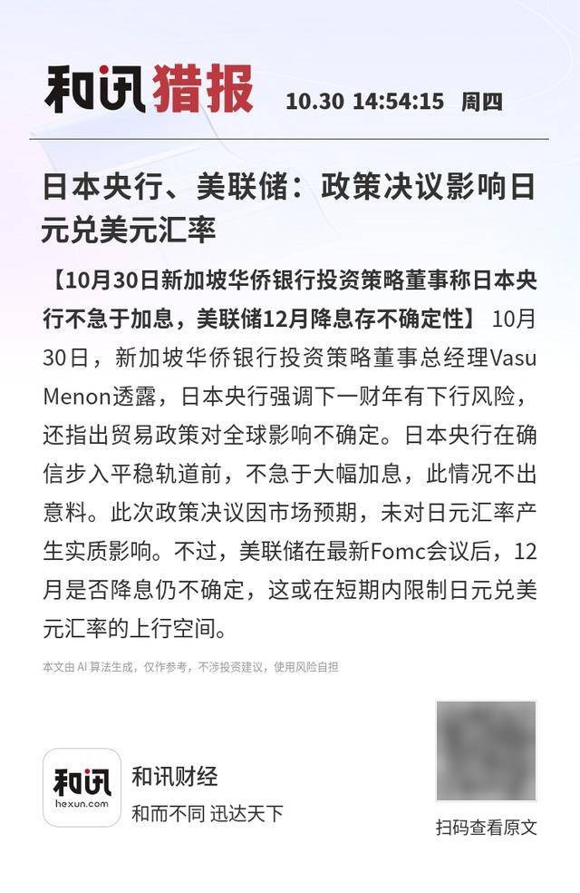 【10月30日新加坡华侨银行投资策略董事称日本央行不急于加息,美联储12月降息存不确定性】10月30日,新加坡华侨银行投资策略董事总经理Vasu Menon透露,日本央行强调下一财年有下行风险,还指出贸易政策对全球影响不确定。日本央行在确信步入平稳轨道前,不急于大幅加息,此情况不出意料。此次政策决议因市场预期,未对日元汇率产生实质影响。不过,美联储在最新Fomc会议后,12月是否降息仍不确定,这或在短期内限制日元兑美元汇率的上行空间。