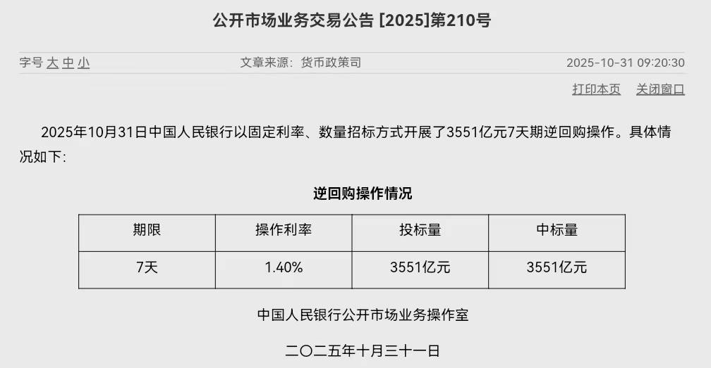 10月31日,中国人民银行以固定利率、数量招标方式开展了3551亿元7天期逆回购操作,操作利率为1.40%,与此前持平。因今日有1680亿元7天期逆回购到期,当日实现净投放1871亿元。