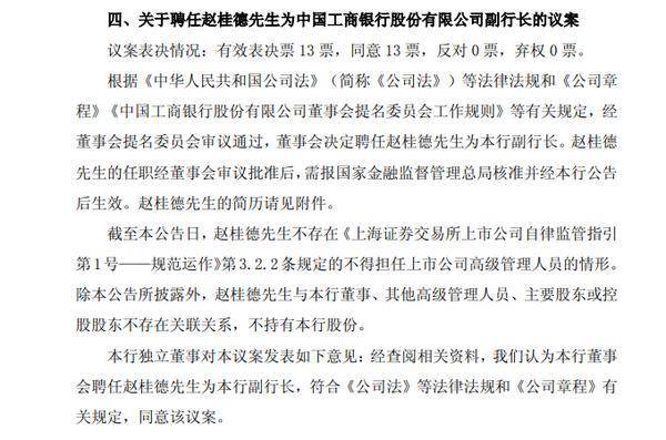 中国网财经10月31日讯 昨日,工商银行发布公告称,董事会于2025年10月30日召开会议,审议通过了《关于聘任赵桂德先生为中国工商银行股份有限公司副行长的议案》。经董事会提名委员会审议通过,该行董事会决定聘任赵桂德为副行长。赵桂德的任职经董事会审议批准后,需报国家金融监督管理总局核准并经该行公告后生效。