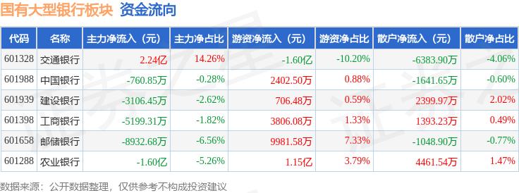 从资金流向上来看,当日国有大型银行板块主力资金净流出1.16亿元,游资资金净流入1.24亿元,散户资金净流出819.72万元。国有大型银行板块个股资金流向见下表: