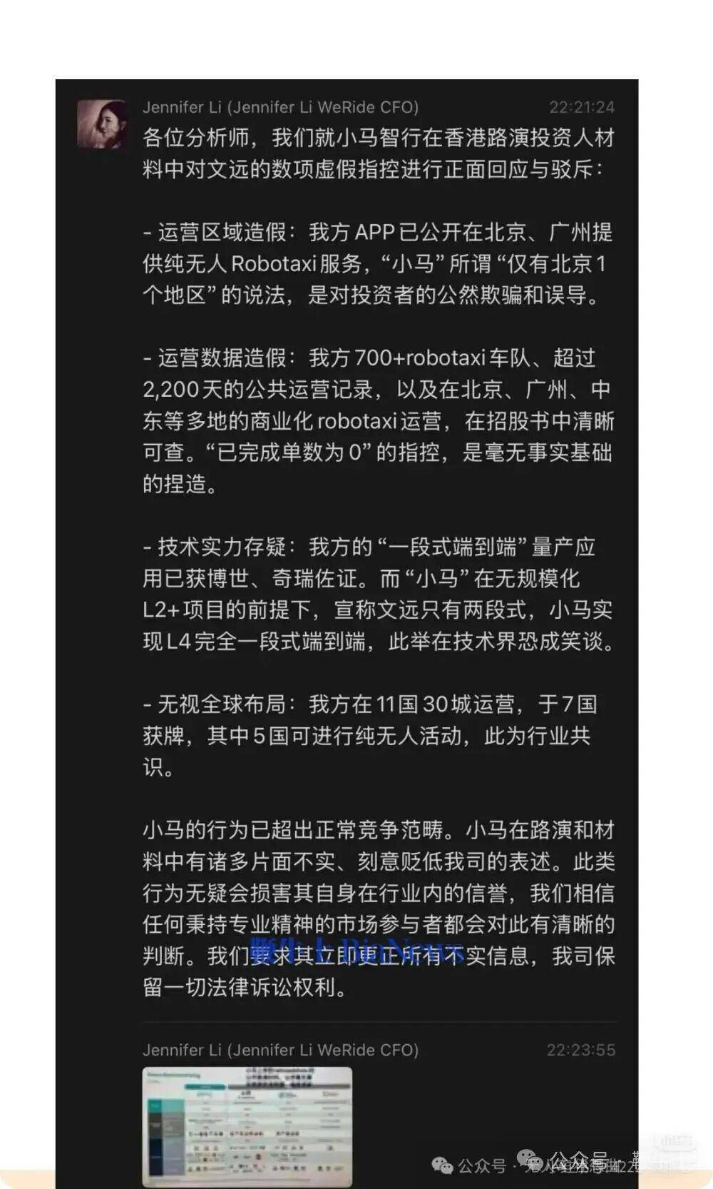 据某分析师透露,10月30日晚,文远知行CFO李璇在分析师群里发长信息,直指小马智行在给香港投资人的路演材料中,存在对文远的不实数据指控,并作出正面回应与驳斥。