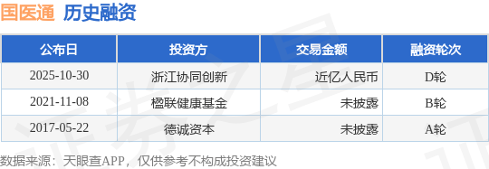 证券之星消息,根据天眼查APP于10月30日公布的信息整理,国医通(北京)科技发展有限公司D轮融资,融资额近亿人民币,参与投资的机构包括浙江协同创新。