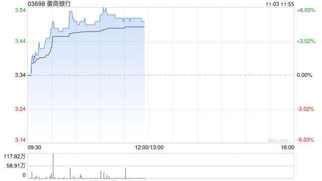 内银股今日回暖,截至发稿,徽商银行(03698)上涨5.09%,报3.51港元;建设银行(00939)上涨2.99%,报7.93港元;中国银行(03988)上涨2.05%,报4.49港元;工商银行(01398)上涨2.49%,报6.17港元。