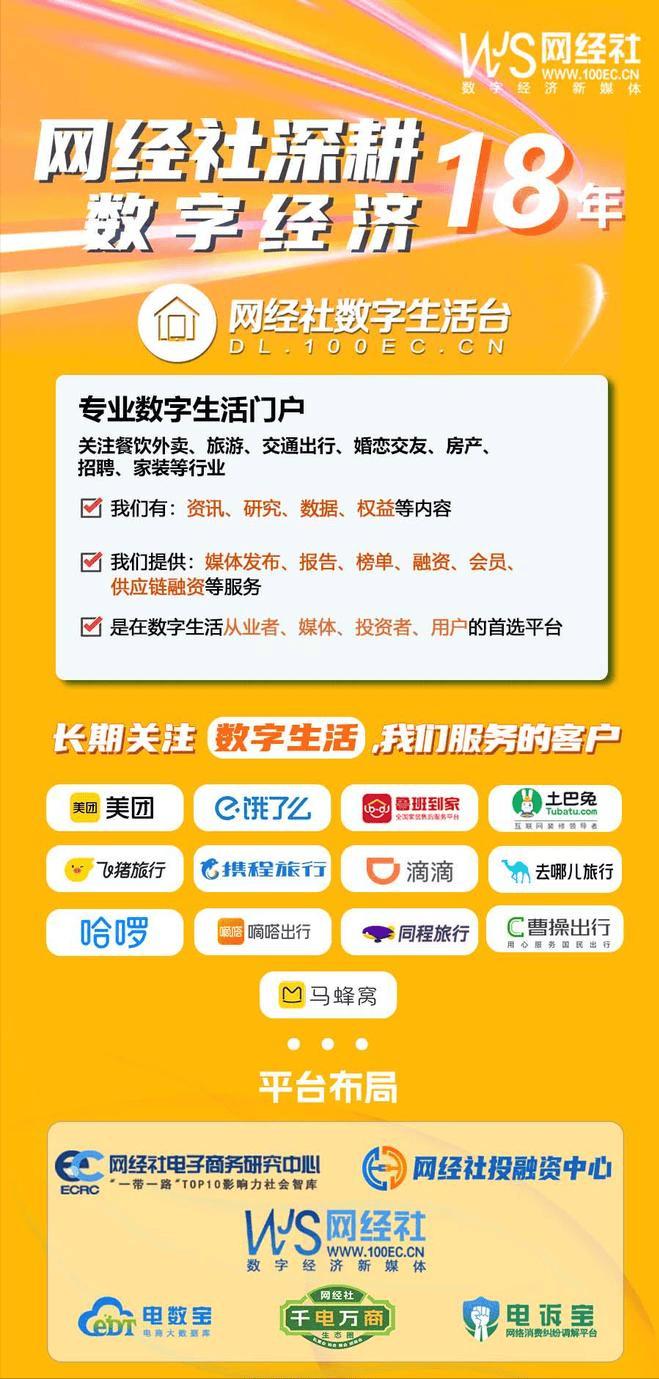 网经社数字生活台是专业数字生活门户,重点关注餐饮外卖、旅游出行、婚恋交友、互联网房产、互联网招聘、互联网家装等;有资讯、数据、研究、权益等内容,提供媒体发布、报告榜单、融资、会员、供应链金融、售后顾问等。