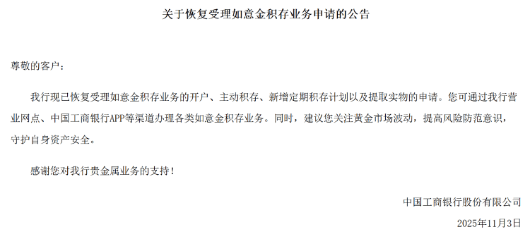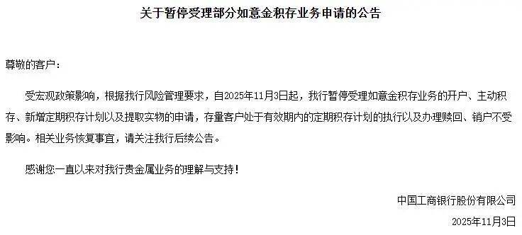 新政实施后,工商银行发布关于暂停受理部分如意金积存业务申请的公告。该公告称,受宏观政策影响,根据工商银行风险管理要求,自2025年11月3日起,该行暂停受理如意金积存业务的开户、主动积存、新增定期积存计划以及提取实物的申请,存量客户处于有效期内的定期积存计划的执行以及办理赎回、销户不受影响。