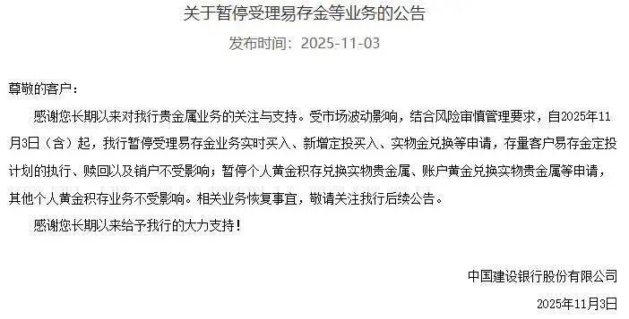 同样在今天,建设银行发布公告,自2025年11月3日(含)起,暂停受理易存金业务实时买入、新增定投买入、实物金兑换等申请,存量客户易存金定投计划的执行、赎回以及销户不受影响;暂停个人黄金积存兑换实物贵金属、账户黄金兑换实物贵金属等申请,其他个人黄金积存业务不受影响。