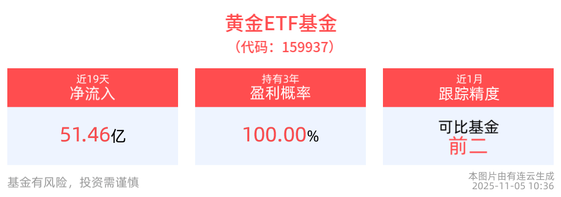流动性方面,黄金ETF基金盘中换手0.98%,成交3.58亿元。拉长时间看,截至11月4日,黄金ETF基金近1月日均成交23.05亿元,居可比基金前3。