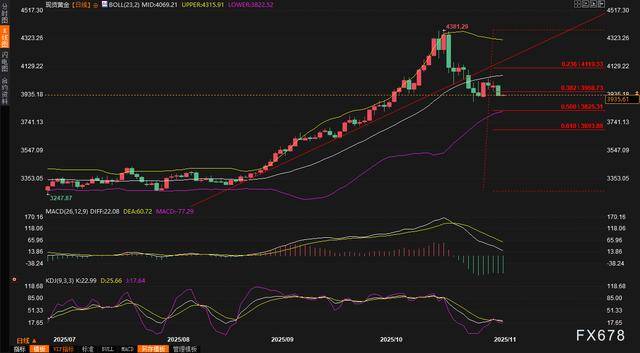 汇通财经APP讯——周二(11月4日)现货黄金震荡下跌1.7%,收报3931.78美元/盎司,12月美国期金同步下挫1.3%,结算价报3960.50美元。美联储官员内部分歧加大,市场对美联储12月降息预期降温,帮助美元指数升破100关口,刷新逾三个月高点,对金价打压明显。不过,美国股市泡沫隐忧与美国政府史上最长停摆仍给金价提供避险支撑。短期内,黄金空头略占上风,金价短线面临进一步回调风险,但若周三ADP民间就业数据爆冷,金价或迎来戏剧性反转。周三(11月5日)亚市早盘,现货黄金窄幅震荡,目前交投于3936.59美元/盎司。