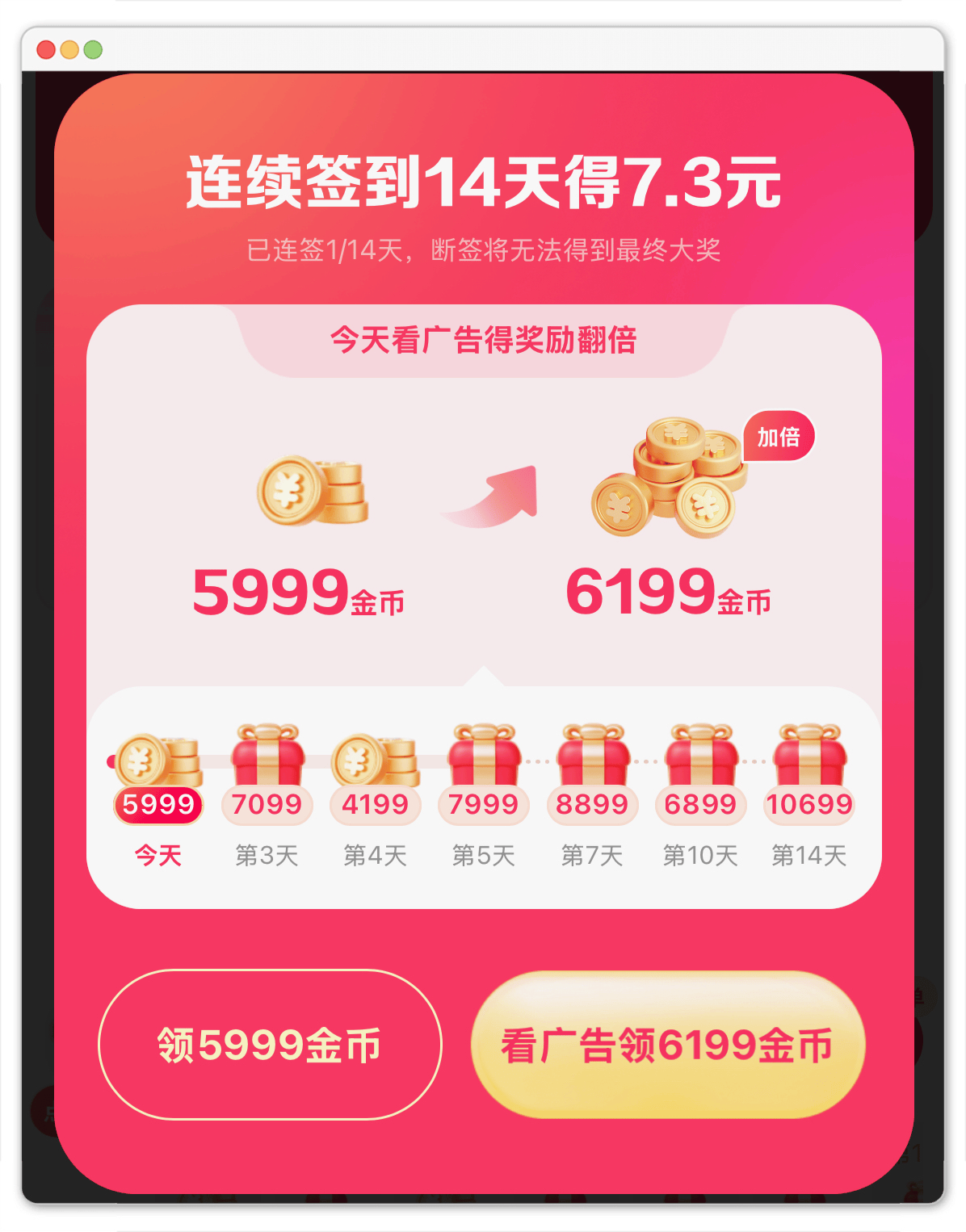但是我主动断签之后,连续三天没有签到,我的签到金币奖励增长为14天7.3元。