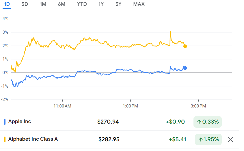 消息公布后,两家公司股价周三短暂跳涨至盘中高点。苹果股价上涨不到1%至271.70美元、Alphabet涨幅一度达到3.2%至286.42美元,随后涨幅均回落。