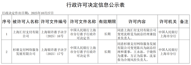 根据许可信息显示,许可文件编号“上海银许准予决字〔2025〕17号”显示,同意杉德支付网络服务发展有限公司变更陈兵为副总经理和董事,王永泳、于晓伟为董事,方正为监事,沈家春为合规风控负责人。