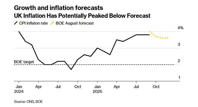 在9月份物价增长出人意料地保持在3.8%之后,大多数经济学家预计英国央行将下调其近期通胀预测。该央行此前曾预计当月通胀率将达到4%的峰值。