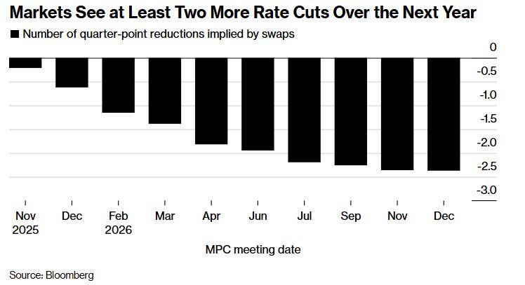 市场和经济学家预计,英国央行会将基准利率维持在4%,放缓自2024年8月以来每季度一次的降息节奏。半小时后,行长贝利将主持新闻发布会。