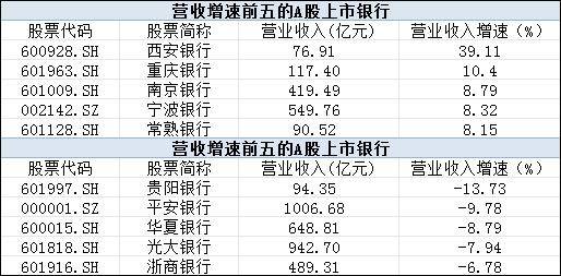 从营收增速来看,西安银行以39.11% 的惊人增速领跑全行业,重庆银行、南京银行、宁波银行分别以10.40%、8.79%、8.32%的增速紧随其后。与此同时,7家银行营收同比下降超过5%,其中,贵阳银行、平安银行、华夏银行分别下跌13.73%、9.78%、8.79%,跌幅居前。