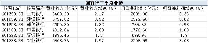 国有大行稳中有进。六大国有银行营收增速集中在0.82%~2.69% 的区间,净利润增速则在0.33%~3.03% 之间。其中,农业银行净利润增速达3.03%,在国有行中表现最佳。