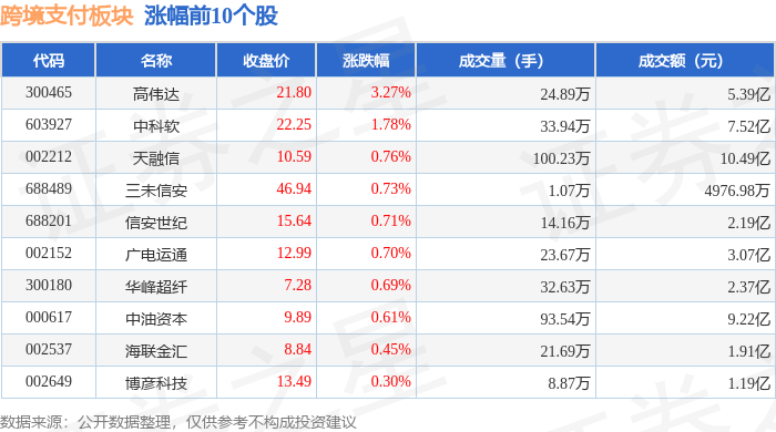 从资金流向上来看,当日跨境支付板块主力资金净流出9.91亿元,游资资金净流入1.03亿元,散户资金净流入8.88亿元。跨境支付板块个股资金流向见下表:
