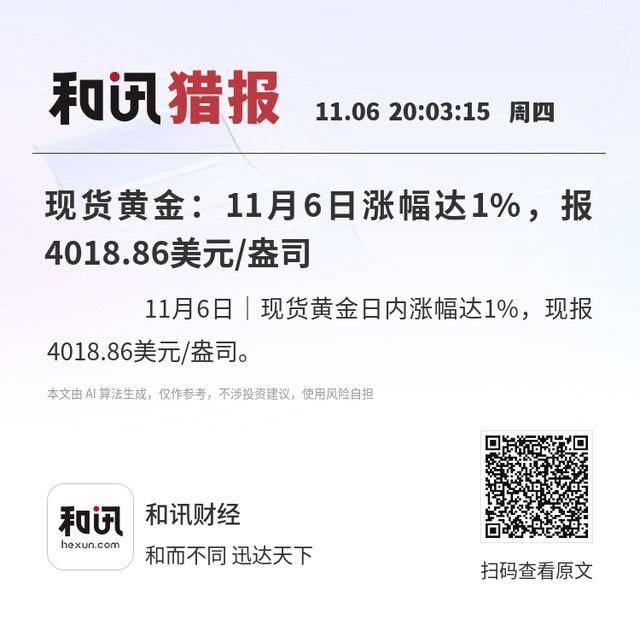 11月6日|现货黄金日内涨幅达1%,现报4018.86美元/盎司。