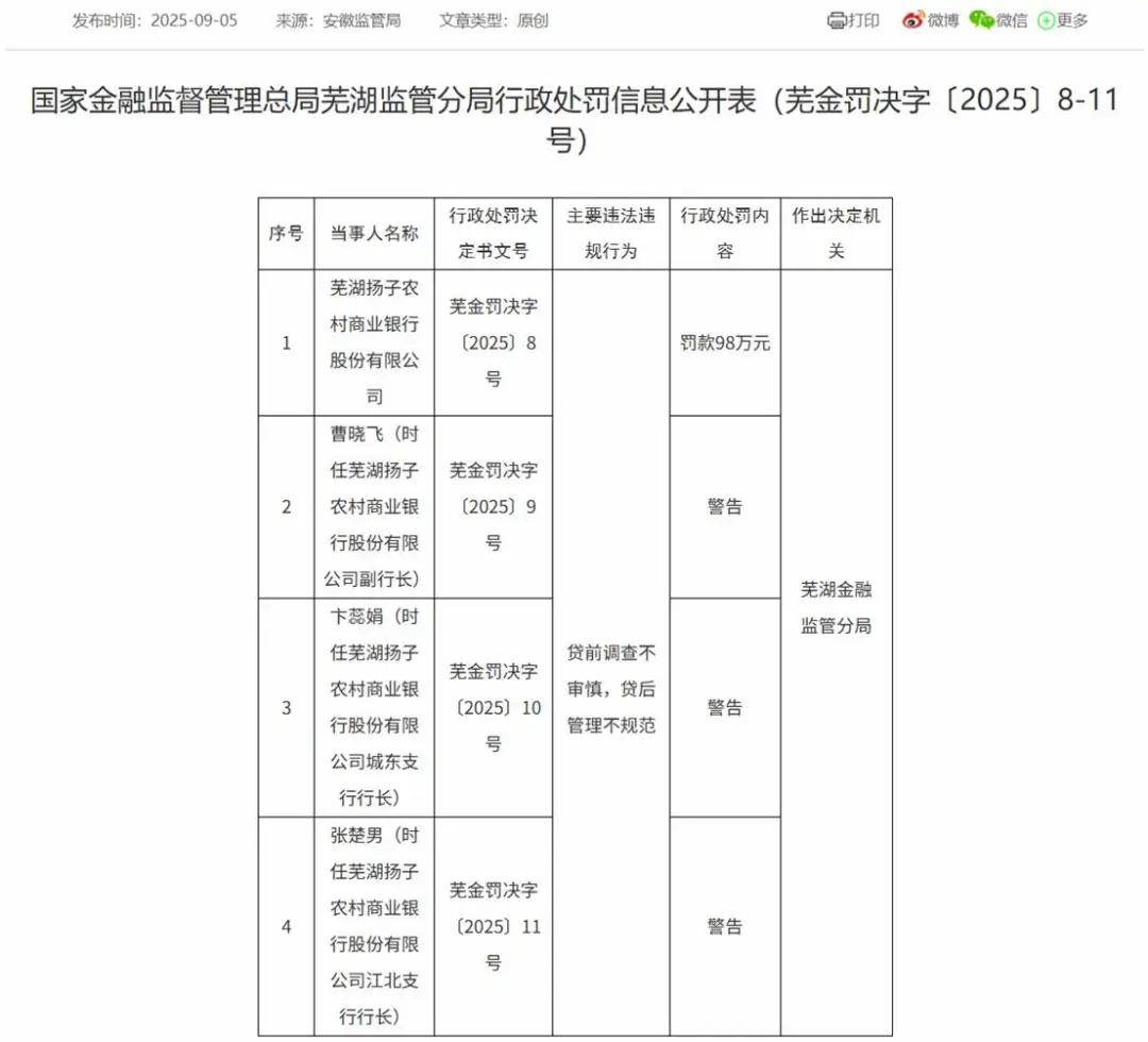 业绩承压的同时,该行合规方面也亮起了“红灯”。今年9月,该行因贷前调查不审慎、贷后管理不规范等违规事项被芜湖金融监管分局罚款98万元。同时,时任该行副行长曹晓飞、城东支行行长卞蕊娟、江北支行行长张楚男均被警告。