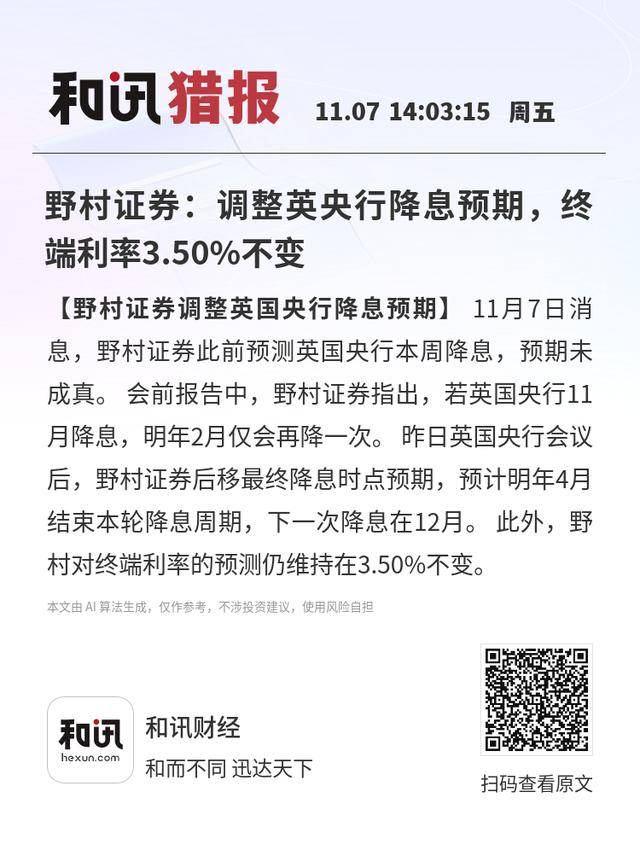 【野村证券调整英国央行降息预期】11月7日消息,野村证券此前预测英国央行本周降息,预期未成真。 会前报告中,野村证券指出,若英国央行11月降息,明年2月仅会再降一次。 昨日英国央行会议后,野村证券后移最终降息时点预期,预计明年4月结束本轮降息周期,下一次降息在12月。 此外,野村对终端利率的预测仍维持在3.50%不变。