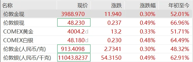 贵金属方面,现货黄金保持微弱涨幅,截至发稿报3988.97美元/盎司,日内涨0.3%。COMEX黄金报4004.2美元/盎司。