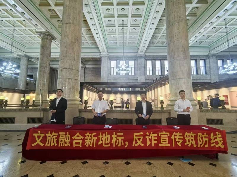 工行吉林省分行充分挖掘伪满中央银行旧址的文旅场景优势,在专题展览期间策划开展大型反诈集中宣传活动。现场设立了醒目的宣传咨询台,宣传专员热情向过往游客发放图文并茂的反诈指南宣传折页。