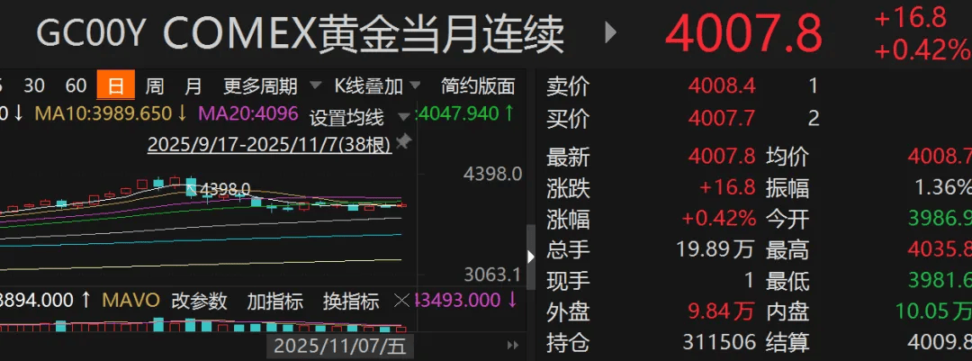 经历了8月以来的一路“狂飙”,10月下旬,COMEX黄金在创出4398美元/盎司的新高后掉头下挫,近日在4000美元/盎司附近盘整。11月7日,COMEX黄金小幅上涨0.42%,收报于4007.8美元/盎司。同时,11月以来资金仍在逢低流入黄金ETF,净申购份额逼近3亿份。