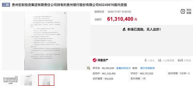 此前,11月6日上午10时,另外一笔约6025万股贵州银行股权在阿里资产交易平台正式开拍,起拍价为6134.04万元,评估价为9579.75万元( 1.59元/股),其首次拍卖的起拍价为7663.8万元(折合每股约1.27元)。尽管起拍价较首次已下调20%,但二次拍卖仍无人问津而流拍。