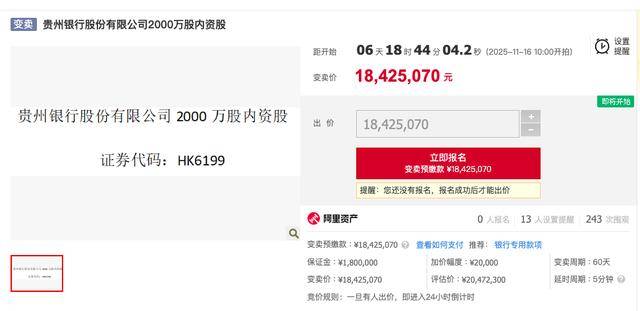 阿里资产交易平台信息显示,贵州银行(证券代码:HK 06199)2000万股的内资股将于11月16日上午10时开拍,起拍价为1842.51万元,评估价为2047.23万元。