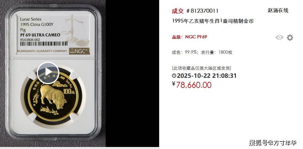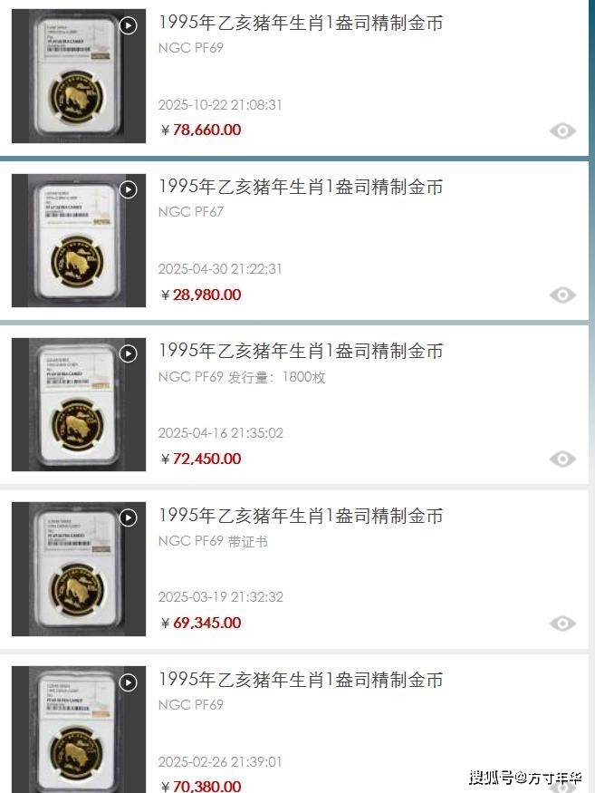 枚猪年金币的成交轨迹:PF69高分品相,2024年下半年卖到89,010元、90,045元,2025年仍保持70,380元-78,660元的价位;PF67品相的,从21,73元涨到28,980元。这说明品相越好、存世越稀,价格天花板越高,抗跌性也越强。