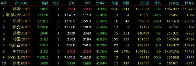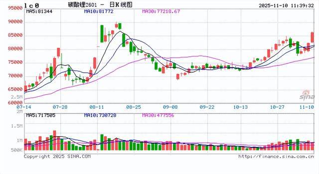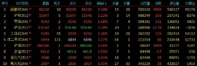 2025年11月10日,早盘收盘,国内期货主力合约涨跌互现。碳酸锂涨超6%,沪银涨超2%,苹果、沪金、工业硅、PX涨超1%;跌幅方面,玻璃跌超3%,集运欧线跌近2%,焦煤、焦炭、沥青跌超1%。