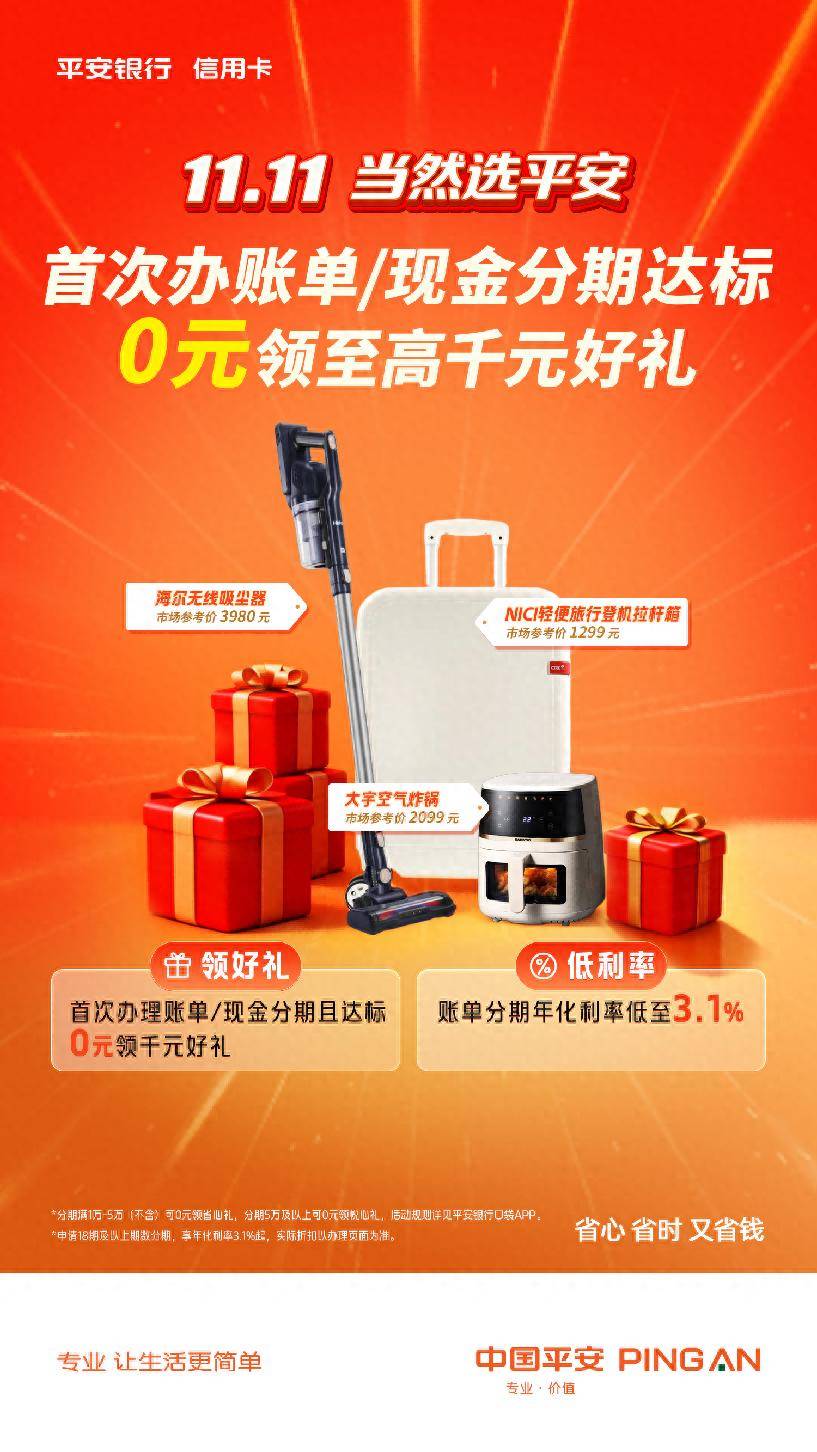 而对于从未办理过账单分期或现金分期的“首分期”用户,平安银行信用卡则准备了更具诱惑力的“见面礼”。在指定时间内,首次办理单笔1万元以上的分期并选择12期及以上,即可0元领取NICI行李箱、多喜爱纯羊毛冬被等品质好礼。若分期金额满5万元,更能解锁海尔无线吸尘器、可视化电烤炉等更高价值的“悦心礼”。这一设计巧妙地将用户的财务规划与生活品质提升相结合,让您在轻松还款的同时,还能为家居生活增添一份惊喜。