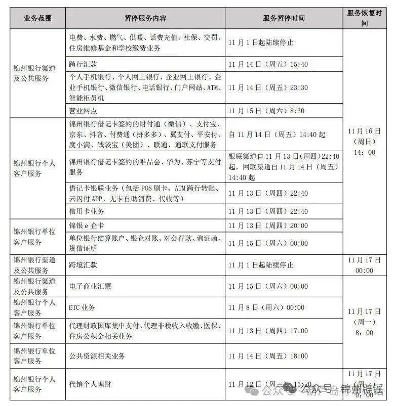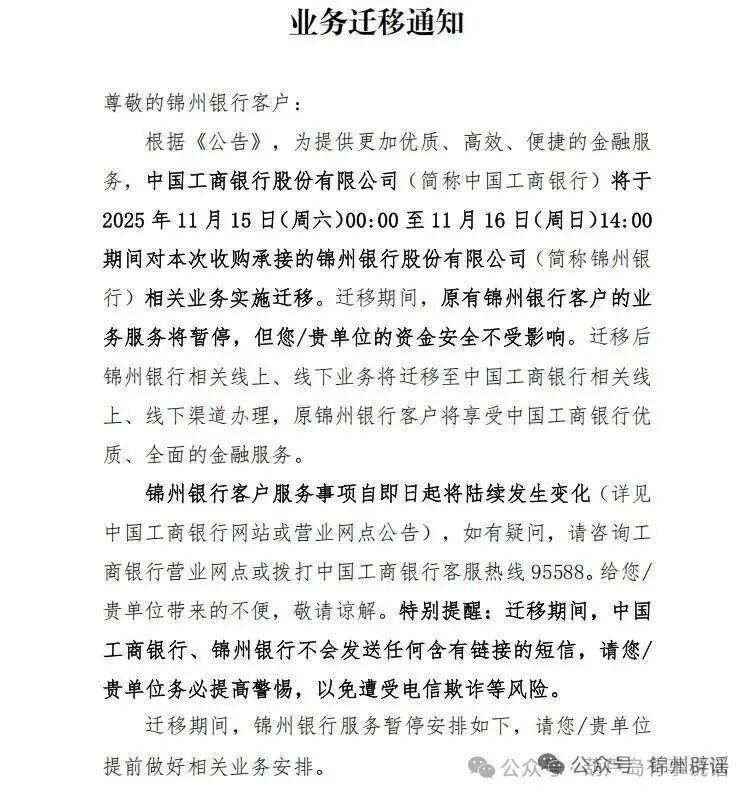 致锦州银行持卡人:关于锦州银行业务迁移的通知