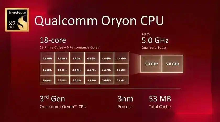 高通骁龙X2 Elite搭载全新Oryon v2架构,基于台积电3nm先进制程,实现了性能与能效的双重突破。其最引人注目的成就,是在多核负载下仍能保持持续50%的性能提升,彻底解决了高性能状态下的降频难题。无论是编译大型代码库、渲染复杂3D场景,还是并行运行多个虚拟机,设备都能保持始终如一的巅峰状态。