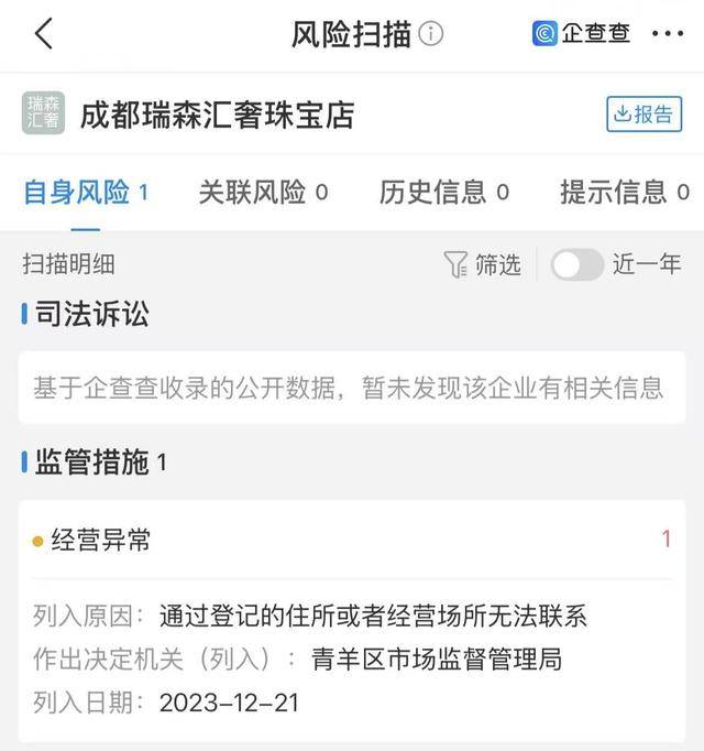 11月10日,记者向青羊区市场监督管理局致电反映此事,接线人员表示,涉事的“成都瑞森汇奢珠宝店”已列入经营异常名录,通过登记的住所或者经营场所已无法联系,所以无法开展行政调解。“如果他是商家并且地址还在,那我们是可以进行行政调解的,但这种情况属于他个人行为,我们是没有办法处理的。”最后,接线人员告诉记者,可以通过合法途径维护自己的权益,例如通过司法途径,但无法给出具体建议。
