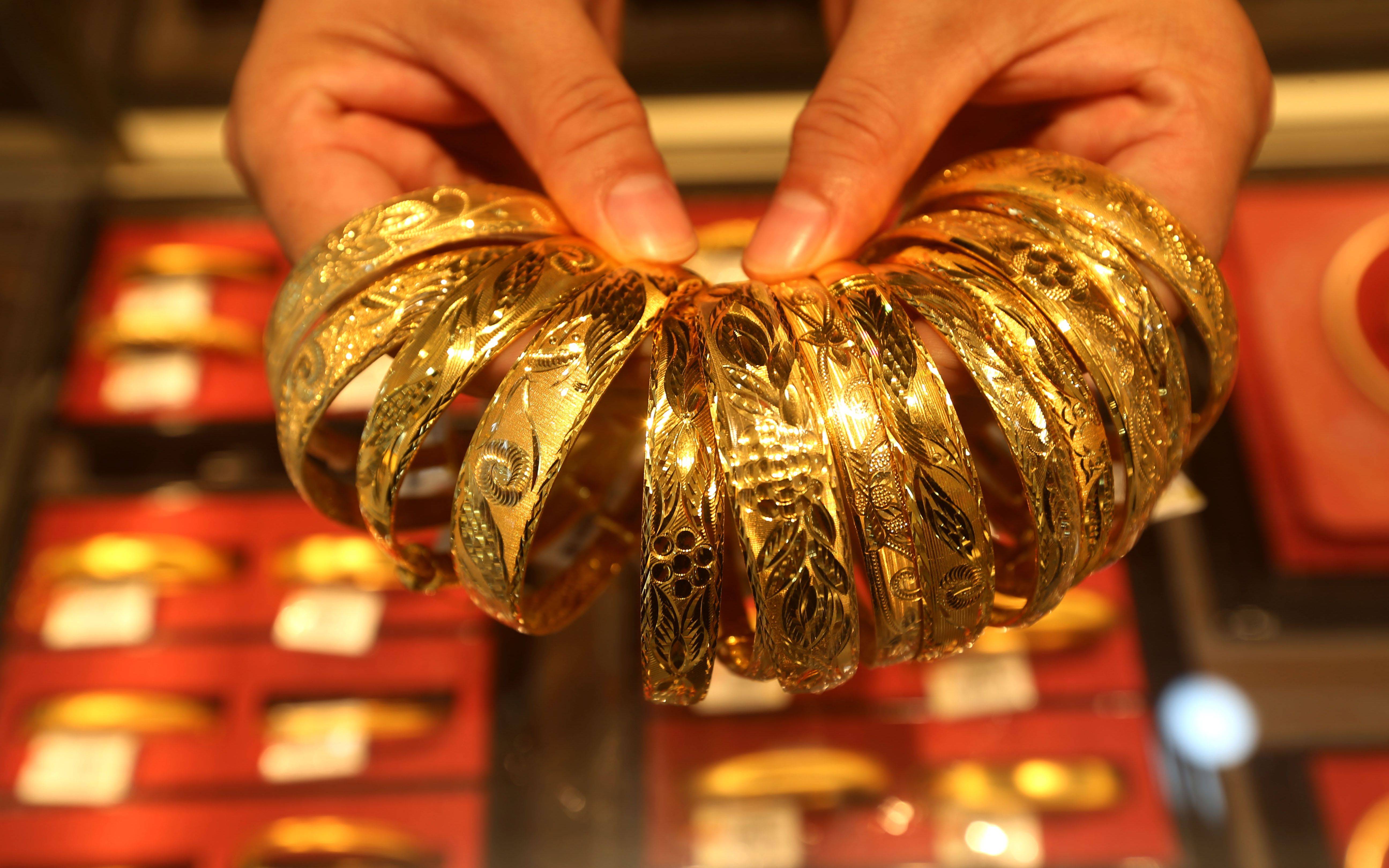 10月9日,一家黄金店的店员在整理黄金饰品。图/新华社