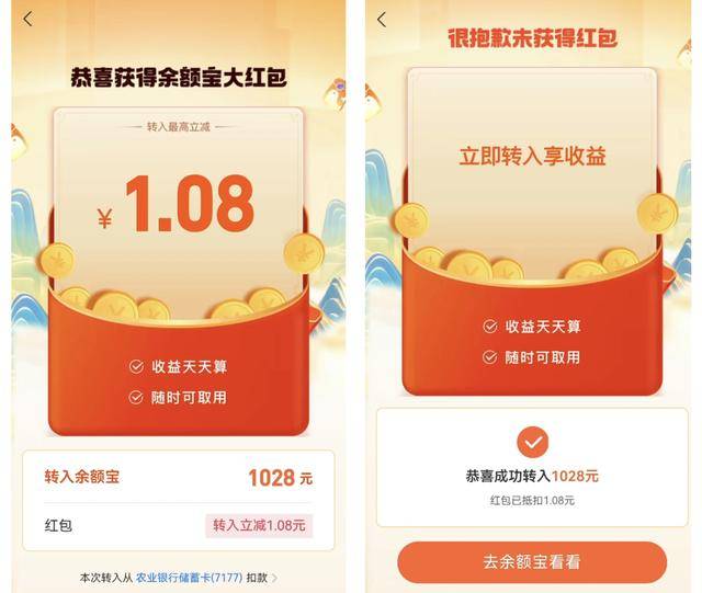 “此活动为支付宝随机推送红包活动,活动页面有一个红包的领取,上面显示从银行卡转入余额宝1028元会抽取1.08元的红包,此笔款项可通过密码、指纹或刷脸三种方式中任一方式转入。”上述客服说。