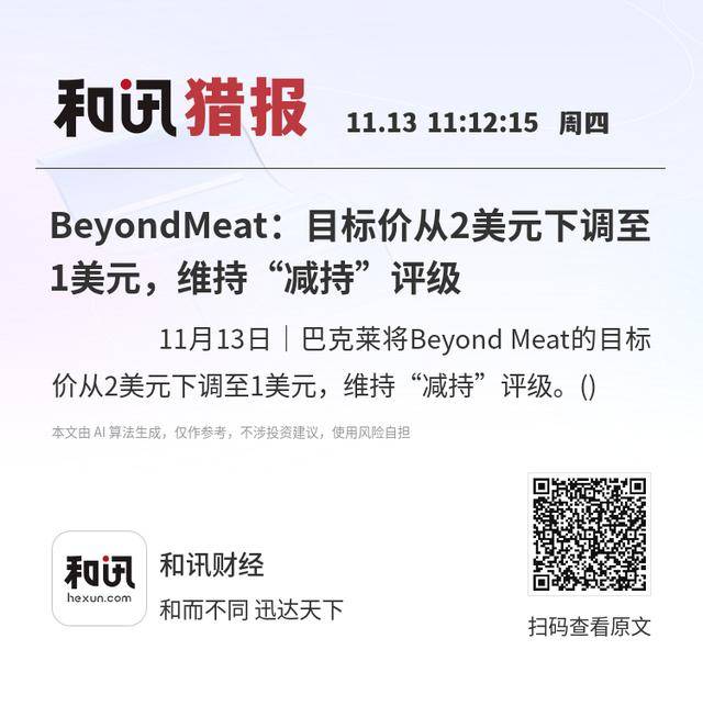 11月13日|巴克莱将Beyond Meat的目标价从2美元下调至1美元,维持“减持”评级。