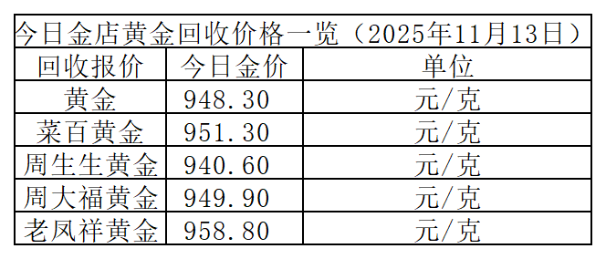 另外,今日黄金回收价格也是大涨15.6元/克。不同品牌回收价差较大,以下为部分金店回收参考价: